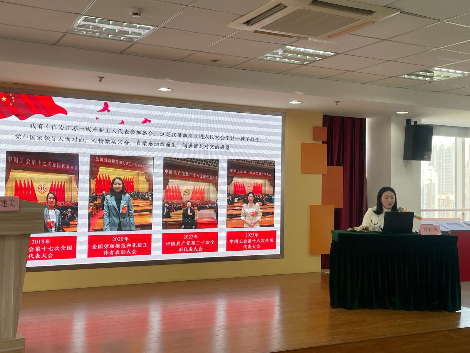 会上,中国工会十八大代表、全国劳动模范——袁彩凤从大会盛况、大会主题、大会成果、大会精神等方面进行了传达。中国工会十八大是在我国迈上全面建设社会主义现代化新征程,向第二个百年奋斗目标进军的关键时刻召开的一次重要会议,是一次高举旗帜、凝心聚力,继往开来、团结奋进的大会,对于激励亿万职工群众和工会工作者,以昂扬向上的精神风貌和实干担当的奋斗姿态,在全面建设社会主义现代化国家、全面推进中华民族伟大复兴的历史进程中谱写工运事业和工会工作的崭新篇章,具有十分重大而深远的意义,也将激励无锡高新区(新吴区)数十万产业工人踔厉奋发,勇毅前行。袁彩凤在说到自己作为党的二十大代表、全国劳模、两届全国工会代表四次走进人民大会堂时,心情无比激动,向大家分享了自己参会的感受和体会。