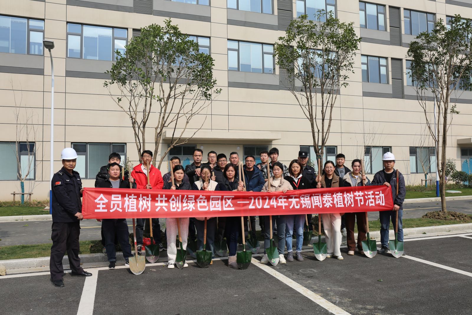 活动中,大家撸起袖子,挥锹铲土、扶树填坑、踩土定植、浇水灌溉,或三人一组,分工合作、配合默契,一派热火朝天的景象。经过两个多小时的忙碌,三十多棵硕大的桂花树在闻泰科技无锡智能制造产业园内安了家,承载着大家的绿色希望,迎风挺立,展现出一片蓬勃生机。