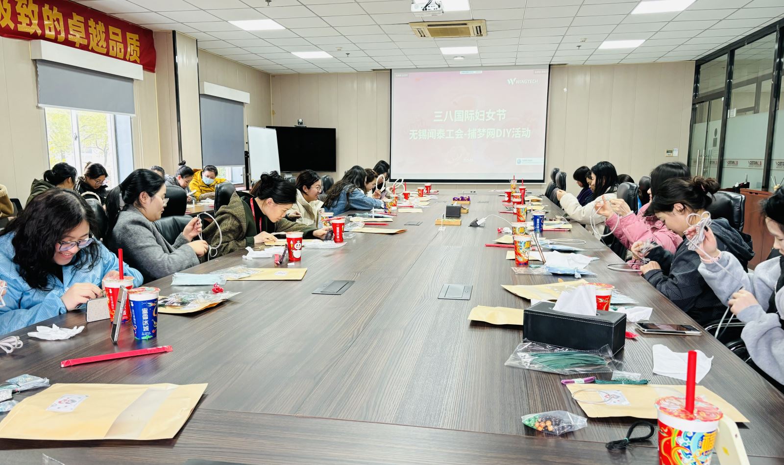3月7日下午,工会又组织开展了“三八节”主题活动——捕梦网DIY活动。活动现场,工会干部贴心的为每位参加活动的女职工准备了奶茶、小点心,让每一位参加活动的职工感受到来自工会的温暖。活动开始后,大家通过视频教程编织着“捕梦网”,时不时的相互讨论编织的手法、互相传授经验。