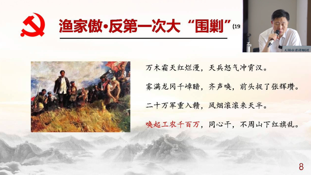 由中共无锡市委讲师团团长、无锡市思想政治工作研究会会长王铭涛老师结合诗词创作背景还原革命历史场景,用诗词里的战斗故事串联起党的百年征程,让大家在诗词的意境中感受时代变迁,在历史的脉络中体会初心使命并保持质朴的情怀,始终做到对党忠心、务实为民;要保持向上的动力,始终做到求学好知、持续精进;要保持克难的勇气,始终做到坚定信心、满怀希望。