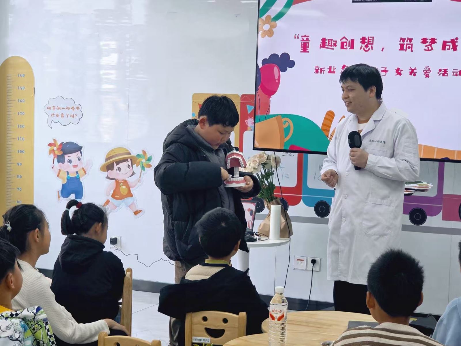 活动以“健康科普与生活美育”为主线,兼顾实践体验与知识学习。活动现场布置温馨,气球与装饰营造出轻松愉悦的氛围。开场后,创意工坊“我的植物冰箱贴”正式开启,在手工老师指导下,孩子们利用磁铁、植物标本等材料发挥想象力,精心制作专属冰箱贴,在创作中感受生活美学、增强家庭归属感;健康科普环节,来自口腔医院的医生通过互动讲解、正确刷牙示范,让孩子们轻松掌握护牙知识,并现场进行免费口腔检查、发放护牙小礼品,帮助孩子树立主动健康管理意识。