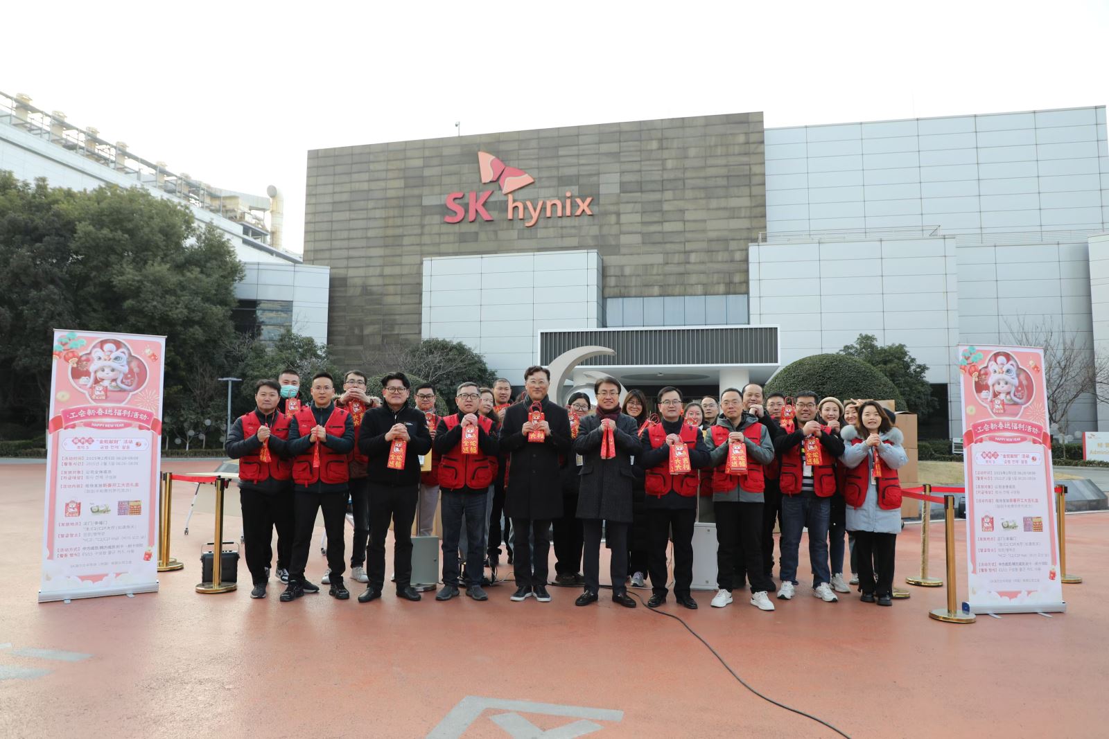 当日早上7:00,无锡FAB李康敏担当、严康龙担当(经营支援), 任晟爀担当(良率分析)、 李基和担当(P&T担当 )四位高层领导,与李德淳总监(无锡 HR )、公司党委 、工会的主要工作人员早早在公司幸福1门,幸福2门就位,为每一位坚守或奔赴岗位的员工送上了精心准备的开工礼包,以及真挚的新年祝福。