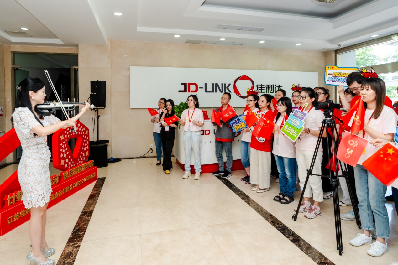 现场,首先由工会副主席虞小娜代表公司工会向无锡市总工会、无锡市工人文化宫表示衷心感谢,感谢将“三送”活动送进江苏佳利达,为佳利达的20周年司庆带来一份珍贵的“文化大礼包”!随后,精彩纷呈的文艺表演点燃了现场气氛。演员们深情献唱了《星辰大海》、《最初的梦想》、《真心英雄》和《我和我的祖国》等脍炙人口的歌曲。激昂的旋律与真挚的歌声,唱出了佳利达人追逐梦想的豪情、不忘初心的坚守以及对伟大祖国的热爱。悠扬的小提琴独奏《世界赠与我的》,则为活动增添了一份优雅的艺术气息,表达了对美好生活的感恩与向往。现场佳利达人挥动小旗,热情欢呼,热烈鼓掌,深深投入其中。.jpg)