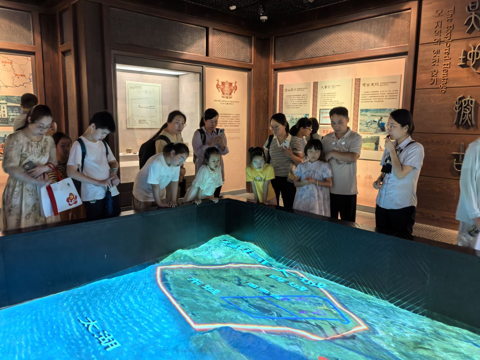 抵达博物馆后,佳利达亲子团在专业讲解员带领下有序进入展厅。从新石器时代的陶器到春秋战国时期的青铜礼器,从反映吴地先民生活的场景复原到阖闾城遗址的考古发现成果,每一件文物、每一段历史都深深吸引着家长和孩子的目光。孩子们时而踮起脚尖仔细观察展柜中的文物,时而拉着家长的手小声提问,“这个青铜器是用来做什么的呀?”“阖闾城以前是怎样的呢?”家长们则耐心陪伴,和孩子一起倾听讲解,共同探寻历史的奥秘。尤其馆中“伟哉・阖闾”互动体验厅令大家非常震撼,让大家沉浸式感受古吴历史。