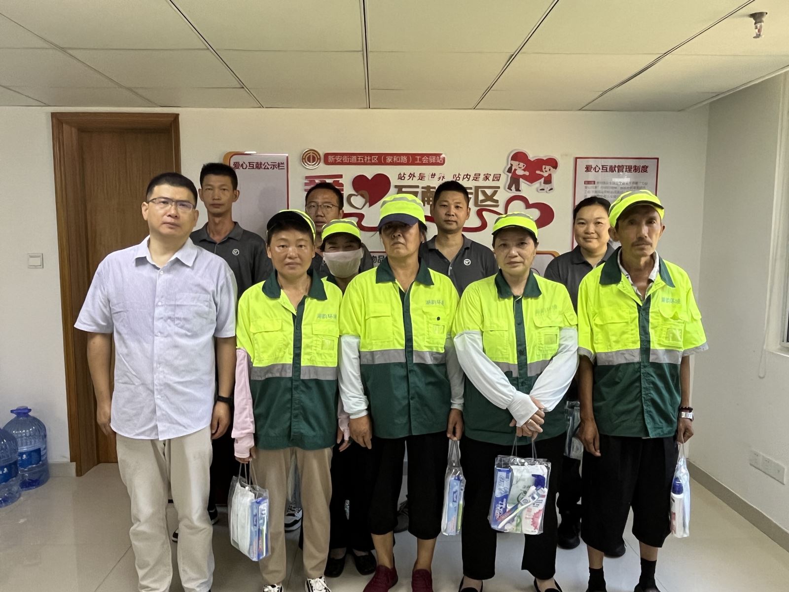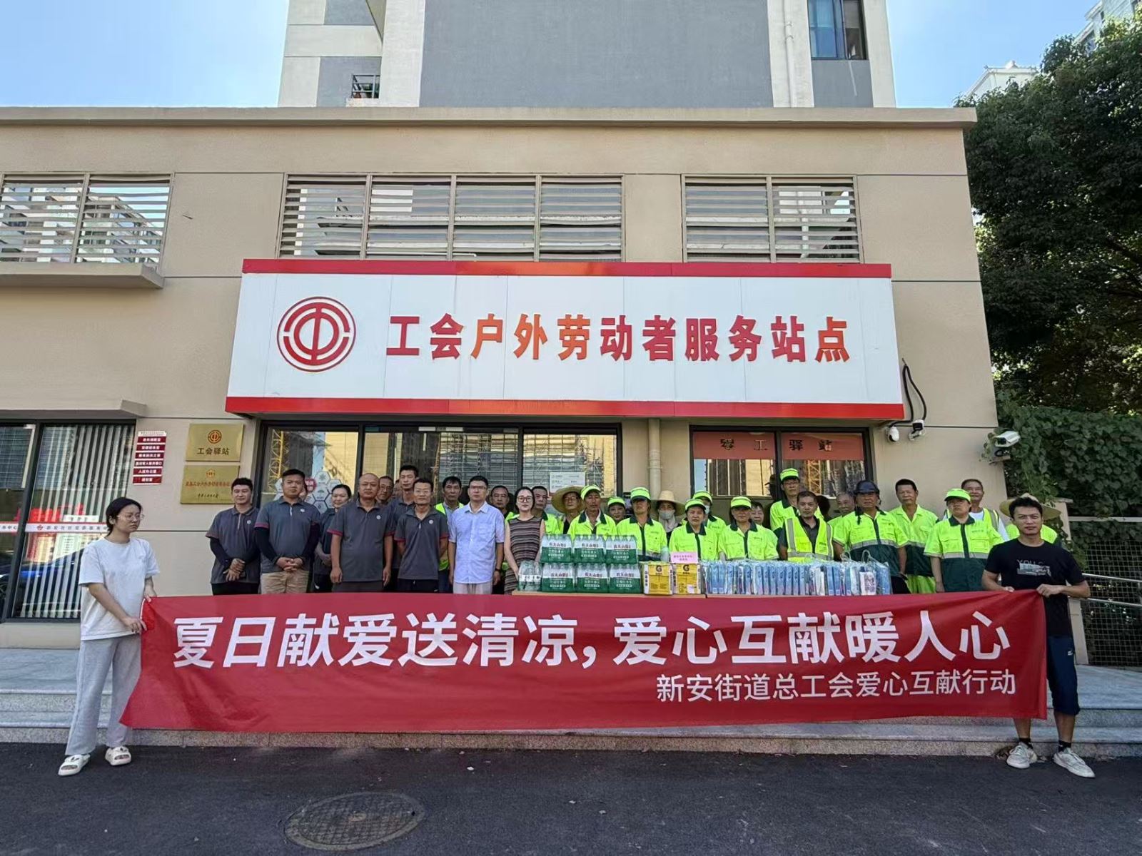 近日,新安街道总工会贯彻落实全国总工会“工会爱心互献”行动号召,联合新吴区企业文化促进会开展“夏日献爱送清凉,爱心互献暖人心”活动,为50名环卫工人、外卖配送员、快递员等户外劳动者送上防暑降温“爱心礼包”,以务实举措彰显工会组织的关怀与温度。