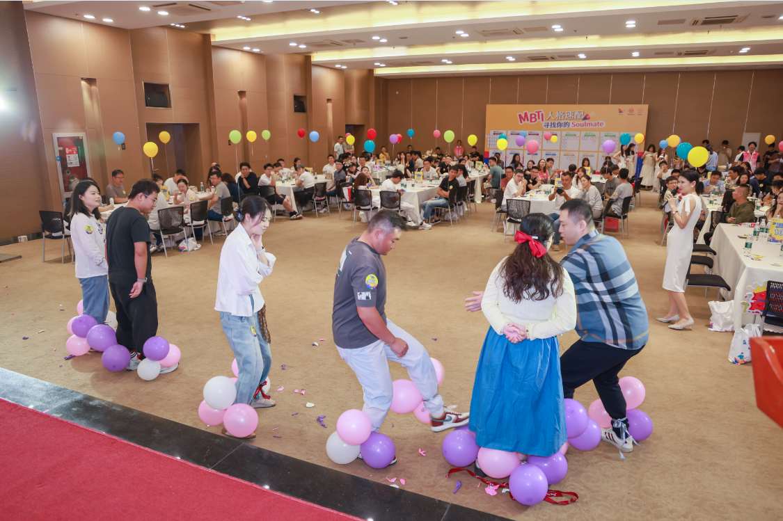 活动以“MBTI人格主题”为特色,创新社交模式。参与者入场时领取专属MBTI名牌,通过性格类型标签快速破冰,寻找志同道合的伙伴。现场设置“锡派公益红娘馆”,特邀无锡本土知名公益红娘“无锡刘阿姨”参与“王婆说媒”环节,结合无锡方言情景互动,为青年们打造独具地方特色的相亲体验,氛围温馨而热烈。互动环节设计精巧,趣味与默契并存。开场“击鼓传花”自我介绍打破拘谨,“气球保卫战”考验团队协作,“默契大考验”则通过肢体语言传递词语,让青年们在欢笑中增进了解。茶歇时段“惊喜对对碰”任务引导参与者主动交流,完成MBTI配对挑战换取礼品,现场洋溢着青春活力。活动尾声的“心动牵手”环节成为焦点,多对青年勇敢表达心意,成功牵手者获得精美纪念奖品。全场人员共同合影留念,定格美好瞬间。参与者纷纷表示,活动不仅拓展了社交圈,更感受到组织方对青年婚恋需求的关怀。