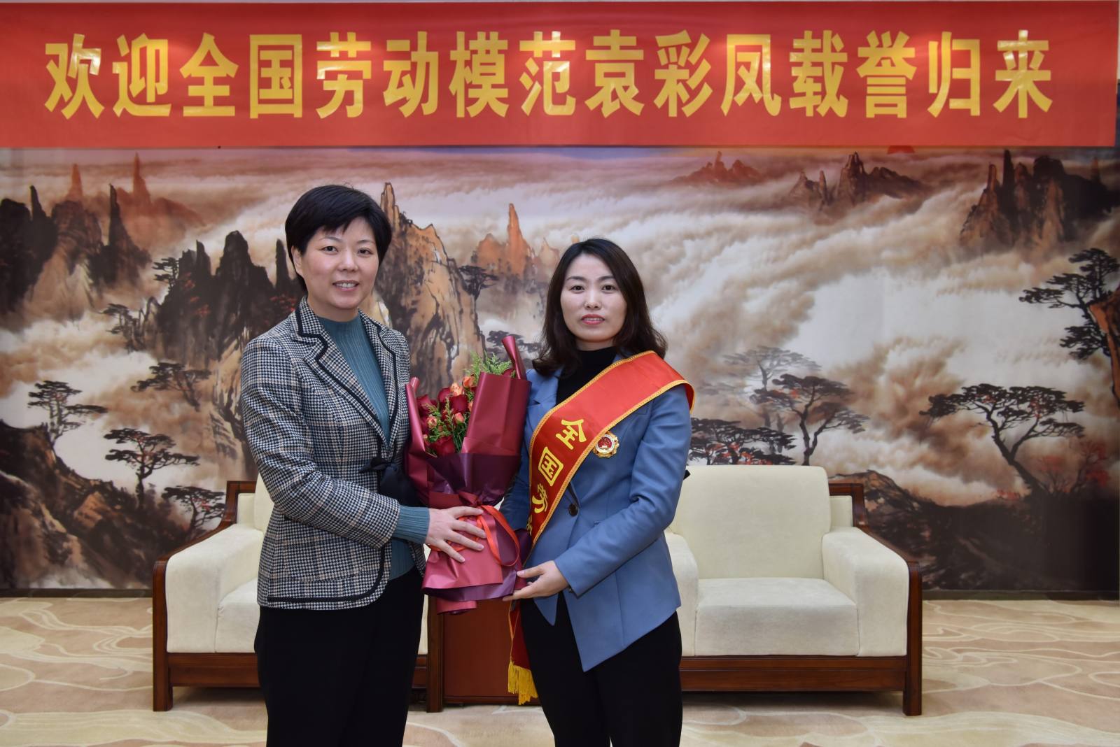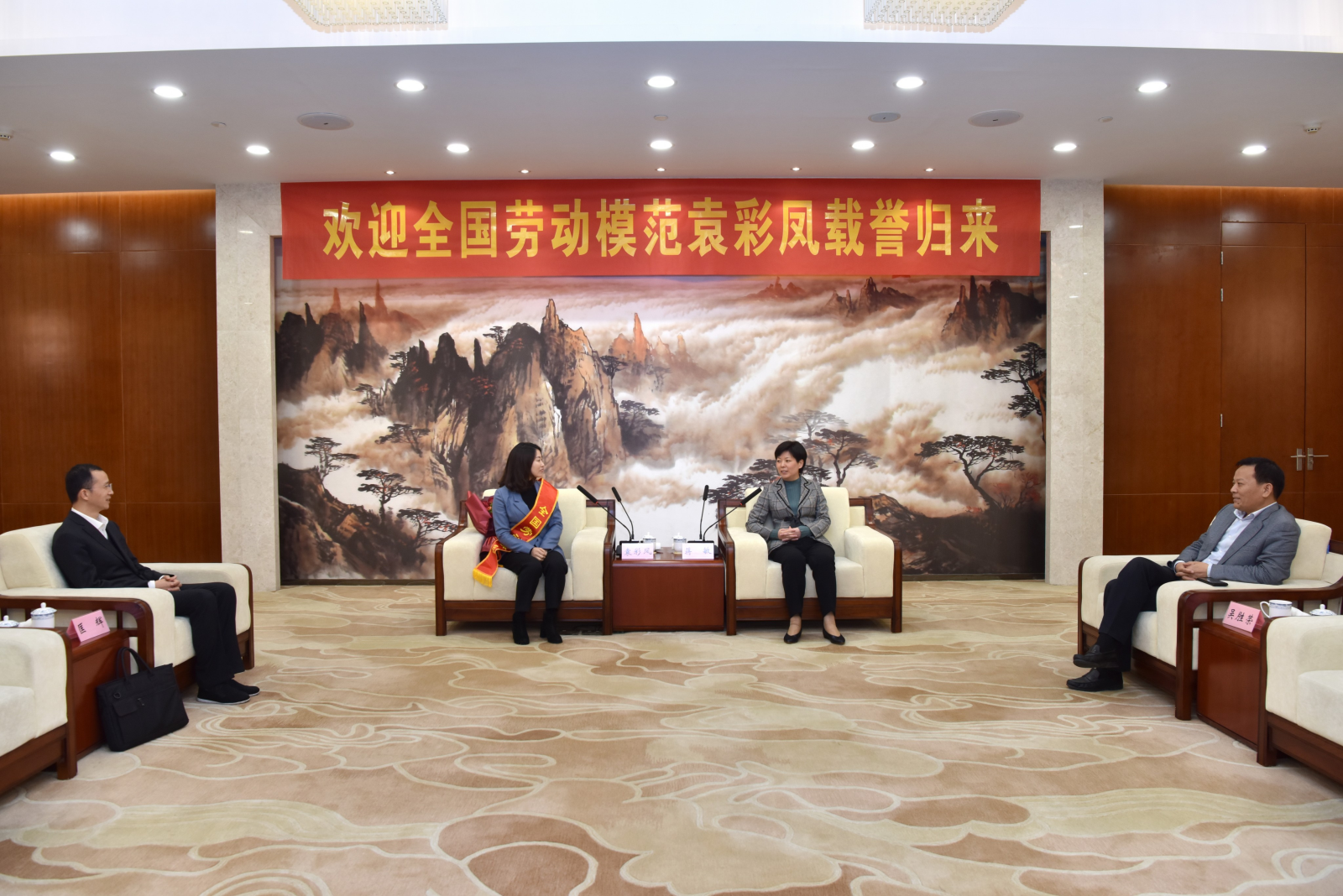 蒋敏代表区委区政府向袁彩凤赴京受奖表示祝贺,与袁彩凤亲切交谈,听取她的受奖感悟、奋斗事迹等,对她的实干敬业、担当奉献表示敬意。蒋敏指出,袁彩凤16年扎根企业,沉下心踏实干,在平凡的岗位上做出了不平凡的成绩,为新吴区赢得了荣誉,也为全区职工树立了榜样。蒋敏希望全体劳模和先进工作者要深刻学习领会习近平总书记在全国劳动模范和先进工作者表彰大会上的重要讲话精神,拼搏奋斗,务实创新,影响带动更多人用劳动创造更加幸福美好的生活。
