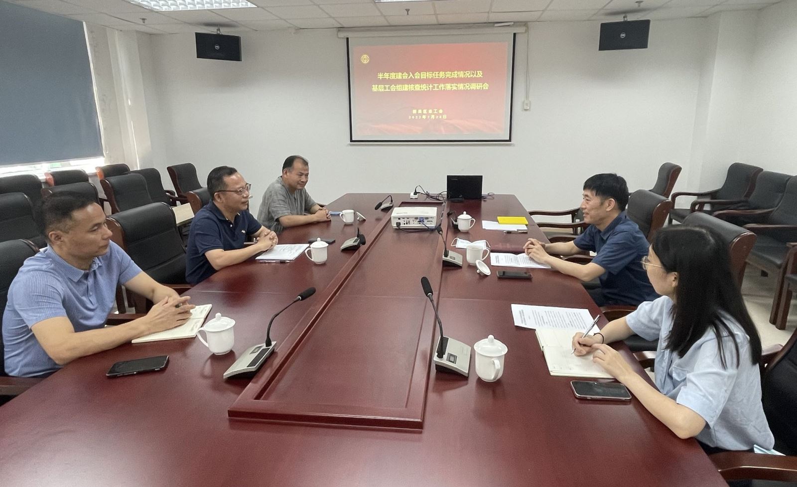 7月28日下午,无锡市总工会党组成员、副主席于立鹏一行赴新吴区调研半年度建会入会目标任务完成情况以及基层工会组建核查统计工作落实情况。新吴区总工会党组书记、副主席夏同军陪同调研。