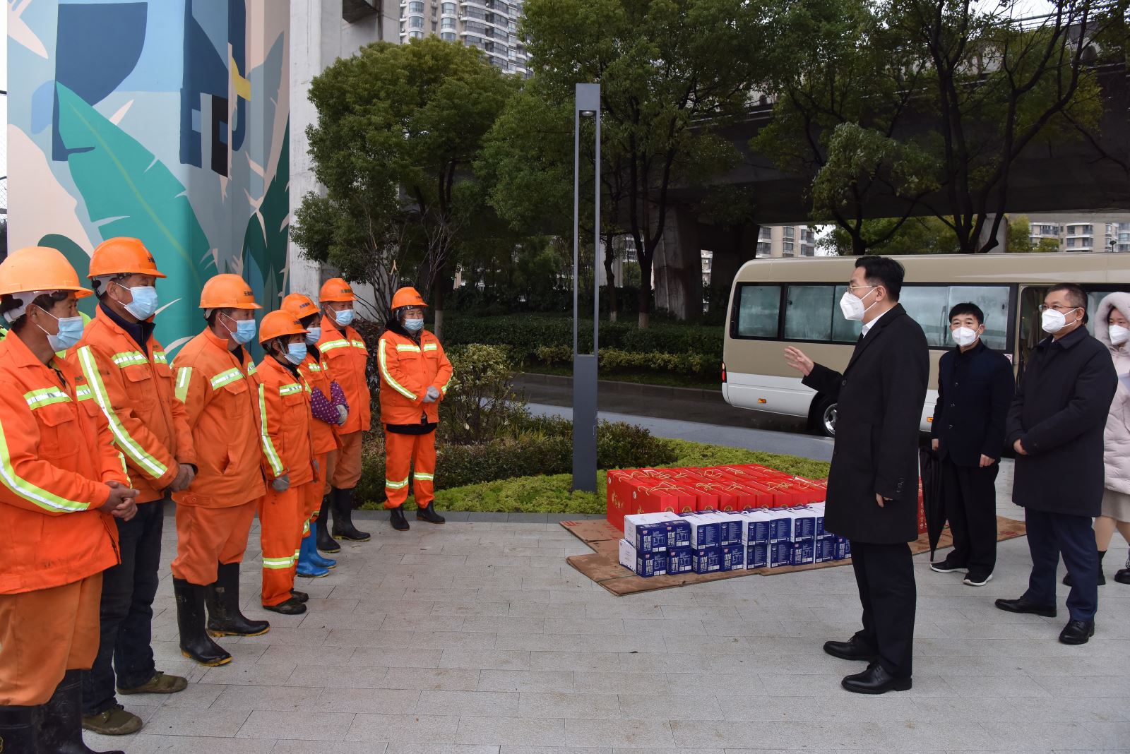 崔荣国一行来到高浪路环卫工人工作场地,为一线环卫工人送去春节慰问品。崔荣国代表区委、区政府向奋战在一线的环卫工人致以问候,肯定了他们为美化新吴、净化环境作出的贡献,对他们所付出的辛勤劳动表示感谢!崔荣国叮嘱他们在寒气凛冽的冬天要合理安排工作,注意身体,做好疫情下的自我保护,过一个安全、祥和、欢乐的春节。希望在新的一年继续发扬兢兢业业、吃苦耐劳的精神,为新吴区的城市环境贡献力量!