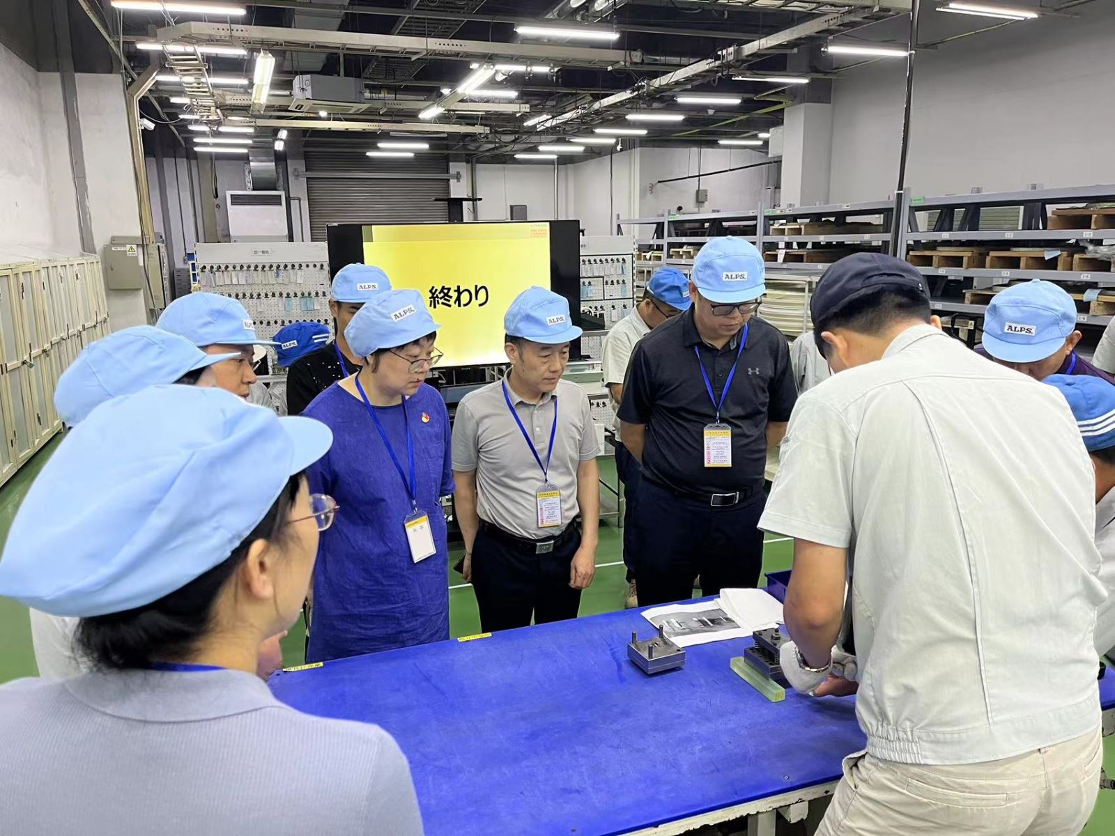 在无锡市阿尔卑斯电子有限公司,施宇星带领工会干部带上工作帽,参观了企业生产车间、职工之家、职工书屋等,了解产改推进情况、企业和职工状况。在第一制造部(部品组立部门),经过车间“师傅”的培训与指导,施宇星一行完成了小型成型模具的拆卸和组装工作,体验了生产的技能,与职工沟通了感情。