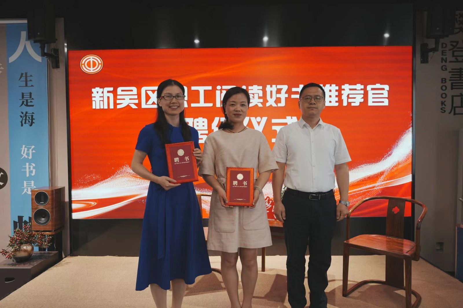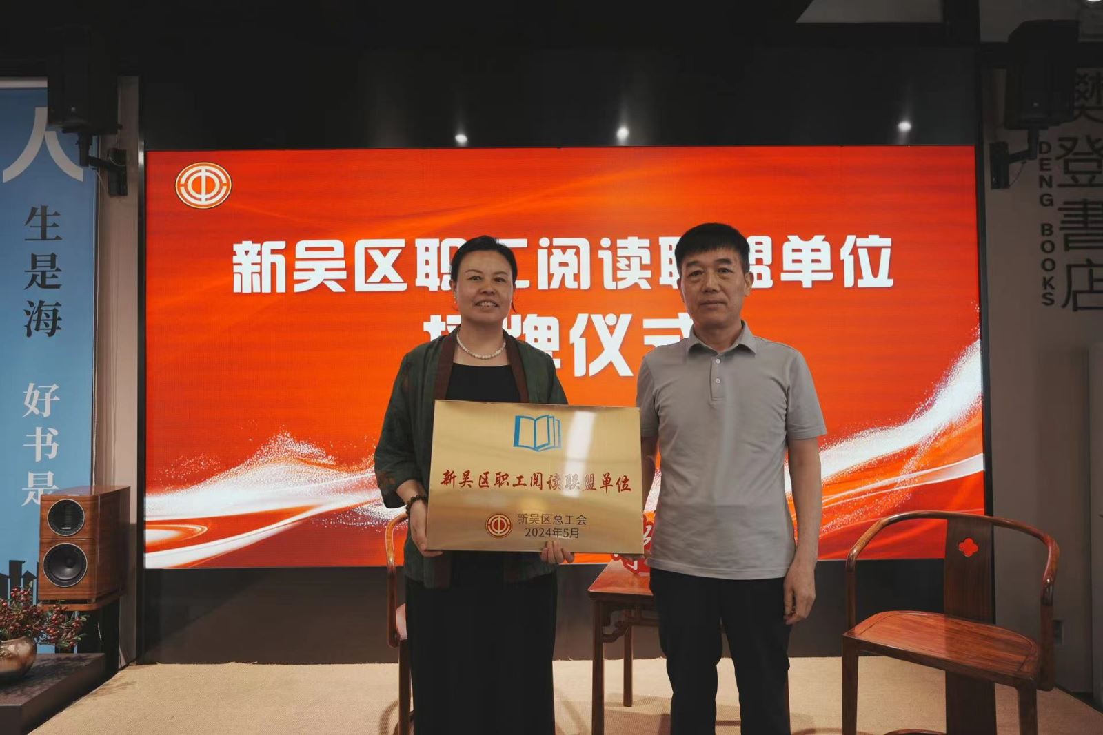 新吴区总工会党组书记、副主席夏同军为新吴区职工阅读联盟单位授牌,并宣布2024年新吴区职工读书月启动。新吴区总工会党组成员、副主席顾国祥为新吴区职工阅读好书推荐官颁发了聘书。