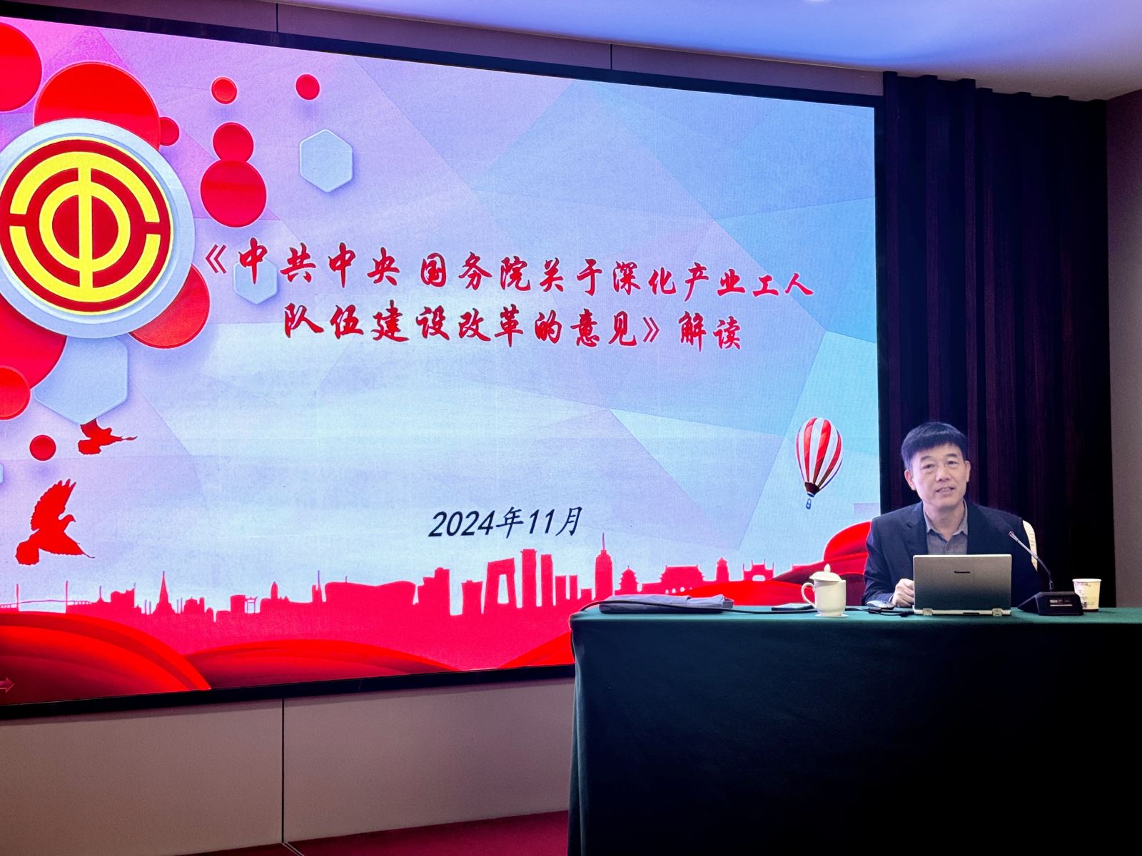 培训班邀请江苏省总工会干部学校教授专题讲授《学习贯彻党的二十大精神 扎实推进产改工作》,讲座以二十大精神为指引,助力经济社会高质量发展的目标,结合产改政策和典型案例,对推进产业工人队伍建设改革的重大意义与目标任务、工作举措探索、阶段成效与思考等进行详细解读。